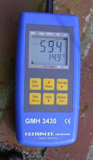 5.) BEISPIELE FÜR DIE KONTROLLE VON WASSERANALYSEN. a.) Ein Leitungswasser soll 10° Gesamthärte, davon 7° Karbonathärte haben. Nach obiger Tabelle ergibt das eine Mindestleitfähigkeit von 393 µS/cm. Ist die gemessene Leitfähigkeit erheblich niedriger, so stimmt eine der Messungen nicht. b.) Ein beliebiges Wasser hat einen pH von 4. Dann muß seine Leitfähigkeit mindestens 42 µS/cm betragen, oder eine der Messungen stimmt nicht. c.) Wird in einem Aquarienwasser 800 µS/cm gemessen, dann kann die Gesamthärte maximal 17°dH sein, wenn keine Karbonathärte vorhanden ist. Besteht die Härte nur aus Karbonathärte, so kann sie nicht höher als 22°dH sein. Ist sie wesentlich niedriger, z.B. 10°dKH und 12°dGH, so bleiben 346 µS/cm für Salze übrig, die keine Härtebildner sind, z.B. Kochsalz. Das wären dann etwa 165 mg/L NaCl. d.) Ein Revers-Osmose-Wasser hat eine Leitfähigkeit von 25 µS/cm. Dann muß die Gesamthärte unter 0,7°dH liegen. Diese Methode erlaubt auch die Maximalhärten von natürlichen Weichwässern abzuschätzen, wenn sie unter 1°dH liegen und die Tropftests keine brauchbaren Ergebnisse mehr liefern. e.) Ein Wasser mit 10°GH wurde mit Salzsäure auf pH 3 angesäuert. Die Karbonathärte wurde in Chloridhärte umgewandelt, die die gleiche Leitfähigkeit wie Sulfathärte hat. Der Beitrag der freien Säure beträgt 409 µS/cm, der der Härte beträgt etwa 470 µS/cm, zusammen etwa 879 µS/cm. f.) Ein vollentsalztes Wasser hat eine Leitfähigkeit von 4 µS/cm. Dann muß sein pH-Wert zwischen 5 und 9,5, seine Härte unter 0,1 °dH, sein Salzgehalt unter 5 mg/L liegen. Zwar ist die Leitfähigkeit verschiedener Stoffe nicht streng proportional (im geraden Verhältnis zu) der Konzentration, aber doch ein gutes Hilfsmittel. Die obige Tabelle sowie die Beispiele ließen sich noch viel weiter treiben. Das würde aber den Rahmen dieses Artikels sprengen. 6.) ZUR PRAXIS DER LEITFÄHIGKEITSMESSUNG. Die Messung ist sehr einfach: Man stellt das Gerät an, taucht die Elektrode ein, liest den Meßwert ab und notiert ihn. Das ist alles. Bei älteren Geräten muß man eventuell auf den passenden Meßbereich umschalten; bei neueren Geräten geht das automatisch. Letztere haben auch eine eingebaute Temperaturkompensation. Ein Temperaturfühler ist Bestandteil der Elektrode. Der Meßwert wird auf 25°C umgerechnet. Wenn das Gerät das nicht kann, muß man zumindest die Temperatur des Wassers messen und notieren, besser aber auf 25°C umrechnen. Ein Grad Celsius Temperaturerhöhung verursacht einen Anstieg der elektrischen Leitfähigkeit um etwa 2,2%.